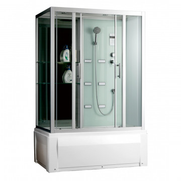 Душевая кабина Frank F556 с паром, имеет интересный дизайн, где сочетается белое стекло и зеркальная панель, на которых гармонично, расположились две большие полочки под предметы личной гигиены, 6 гидромассажных форсунок, ручная лейка и сенсорный пуль управления с системой вентиляции и подсветки. Кабина имеет высокий 55-и сантиметровый поддон, усиленный металлическим каркасом и нагрузка на такой поддон, достигает более 300 кг. Стенки и двери кабины, выполнены из закаленного ударопрочного 6 миллиметрового стекла, а профиля конструкции из высокопрочного алюминия. В данной модели раздвижные двери.Монтаж осуществляется без герметика, что благоприятно отразится на последующем обслуживании кабины.