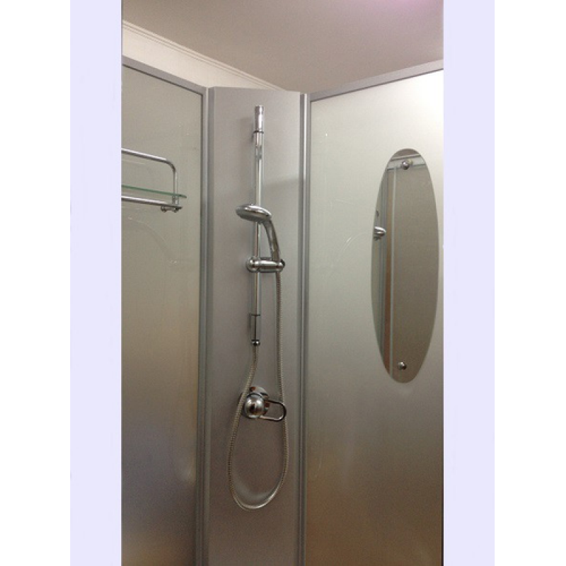 Две раздвижные двери с угла Закаленное безопасное стекло 5 мм Профиль: Матовый хром - без крыши (можно приобрести дополнительно) - задняя стенка стекло - алюминиевая центральная стойка - ручной душ - 5 режимов потока воды - регулирующий держатель д/лейки - смеситель - полка для душевых принадлежностей - зеркало - Поддон Люкс TN - силиконовые и магнитные водонепроницаемые уплотнители