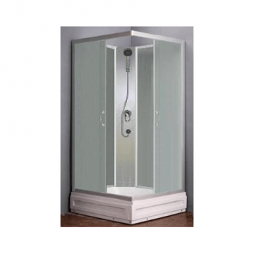 Две раздвижные двери с угла Закаленное безопасное стекло 5 мм Профиль: Матовый хром - без крыши (можно приобрести дополнительно) - задняя стенка стекло - алюминиевая центральная стойка - ручной душ - 5 режимов потока воды - регулирующий держатель д/лейки - смеситель - полка для душевых принадлежностей - зеркало - Поддон Люкс TN - силиконовые и магнитные водонепроницаемые уплотнители