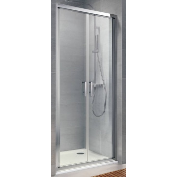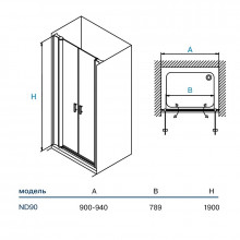 Душевая двухсекционная дверь имеет размер 900×1900 мм, открывающаяся наружу. Состоит из хромированного профиля, матового стекла 6 мм.