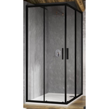 Комфортный душевой уголок квадратной формы с широким угловым входом без возможности комбинации размеров в черном цвете профиля.