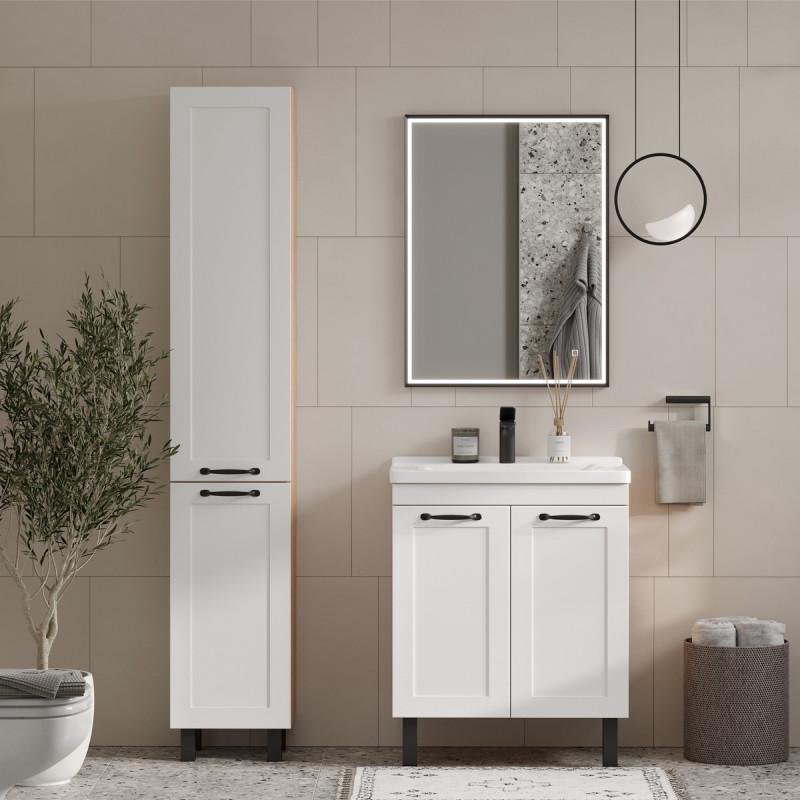 Напольный пенал Equil Lago pnLAGO35-04 с двумя стеклянными полками в верхней секции, выдвижным ящиком и одной полкой из ЛДСП в нижней секции. Петли оснащены доводчиками. Дверцы пенала изготовлены из МДФ и облицованы матовой пленкой ПВХ. Лицевая фурнитура выполнена в черном матовом цвете. Пенал устанавливается на четыре регулируемые опоры и фиксируется к стене при помощи креплений.