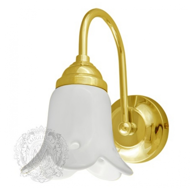 Светильник керамический для ванной MIGLIORE ML.MRL-LP9M выполнен в форме цветка на изогнутой ножке. Металлическая основа имеет пять вариантов цвета, плафон белого цвета изготовлен из керамики. Светильник легко крепится на стену, служит долго и безупречно. Высокое качество.