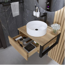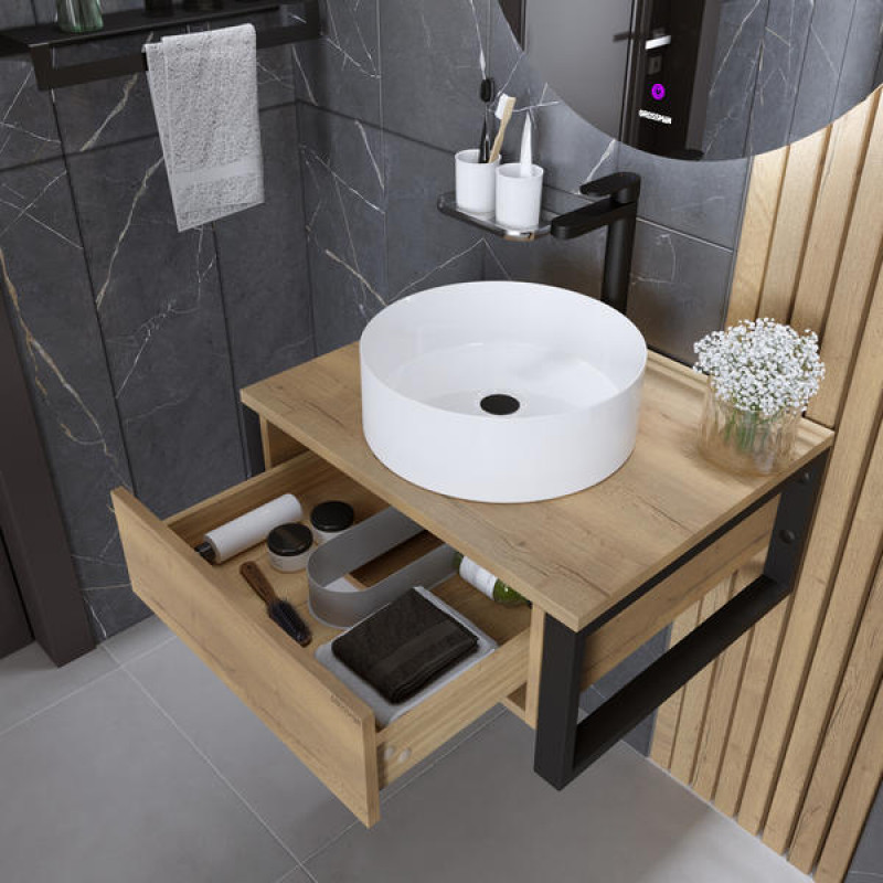 Компактная консоль со сварным каркасом выполнена из металлических профилей и покрыт черной порошковой краской, что придает консоли брутальности. Консоль имеет один вместительный выдвижной ящик с системой организации пространства. Ящик комплектуются направляющими скрытого монтажа. Фасады без ручек с системой открывания «Push to open» делают мебель удобной и практичной в эксплуатации. Корпус и фасады тумбы выполнены из влагостойких материалов, устойчивого к перепадам температуры и высокой влажности, крепится к стене и не занимает место на полу.