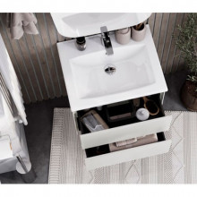 Тумба Сохо 60 функционально состоит из двух вместительных ящиков, оснащенных системой push to open, обеспечивающей надежное, комфортное и бесшумное закрывание. Фасады изделия выполнены из МДФ в пленке в цвете галька серая, корпус из ламинированной влагостойкой ДСП слэйт. Верхний и нижний ящики позволяют содержать косметические средства в идеальном порядке. Дополняет тумбу стильная раковина Элина от бренда Santek с удобной чашей. Все внутренние детали тумбы выполнены в цвете антрацит.