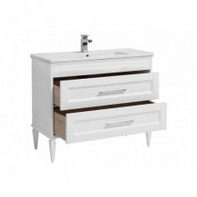 Тумба Aquanet Бостон М 100 белого цвета интересна внешне. Фрезеровка по белоснежным матовым фасадам и по боковым ее частям придает внешнему виду изделия шириной 100 см достойный и благородный вид, свойственный классике. Но утонченные ручки производства известной турецкой фирмы System, словно ниточки поблескивающие на фасадах, визуальная легкость изделия напоминает о модерне. Тумба с двумя выдвижными ящиками, оборудованными доводчиками производства компании Hettich, вмещает огромное количество полезных вещей. В верхнем ящике предусмотрено три отделения, что делает его пространство более удобным для использования: все вещи будут на своих местах. Нижний ящик просторный и в него можно поставить многочисленные шампуни, гели, муссы, маски, кремы и другие емкости. Тумба комплектуется качественной керамической раковиной «Эйфория», изготовленной по чешской шамотной технологии компанией Dreja. Модель имеет два варианта монтажа. Базовый – подвесной. Кроме того, специально для этой коллекции были разработаны очень элегантные ножки, выполненные из массива и окрашенные в белый цвет. С такими ножками тумба приобретает благородный вид и еще больше тяготеет по своему стилю к классике.
