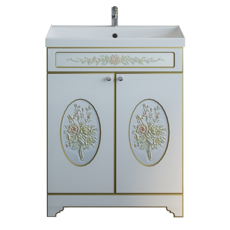 Нежный, воздушный, светлый комплект мебели для ванной комнаты Milano создает в интерьере жизнерадостную и эмоциональную атмосферу. Такой эффект достигается благодаря фасадам, искусно украшенным резьбой в виде букета цветов пастельных оттенков, которые заключены в привлекательные овальные рамы с белоснежным фоном. Изделия бежевого цвета гармонично сочетаются с классическим белым фаянсом. Благодаря патинированию поверхностей достигается изысканный винтажный вид мебели.