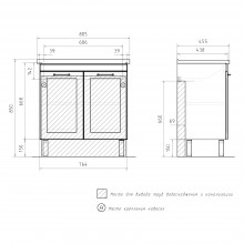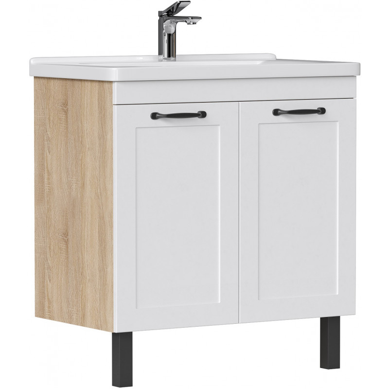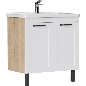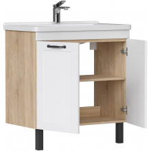 Напольная тумба Equil Lago tnLAGO80.2D-04 с двумя распашными дверцами. За распашными дверцами расположена полка из ЛДСП. Фурнитура оснащена системой плавного закрывания. Фасады тумбы изготовлены из МДФ и облицованы матовой пленкой ПВХ. Дверки открываются при помощи черных матовых ручек. Тумба устанавливается на четыре регулируемые опоры (2 лицевые, 2 монтажные) и фиксируется к стене при помощи креплений.