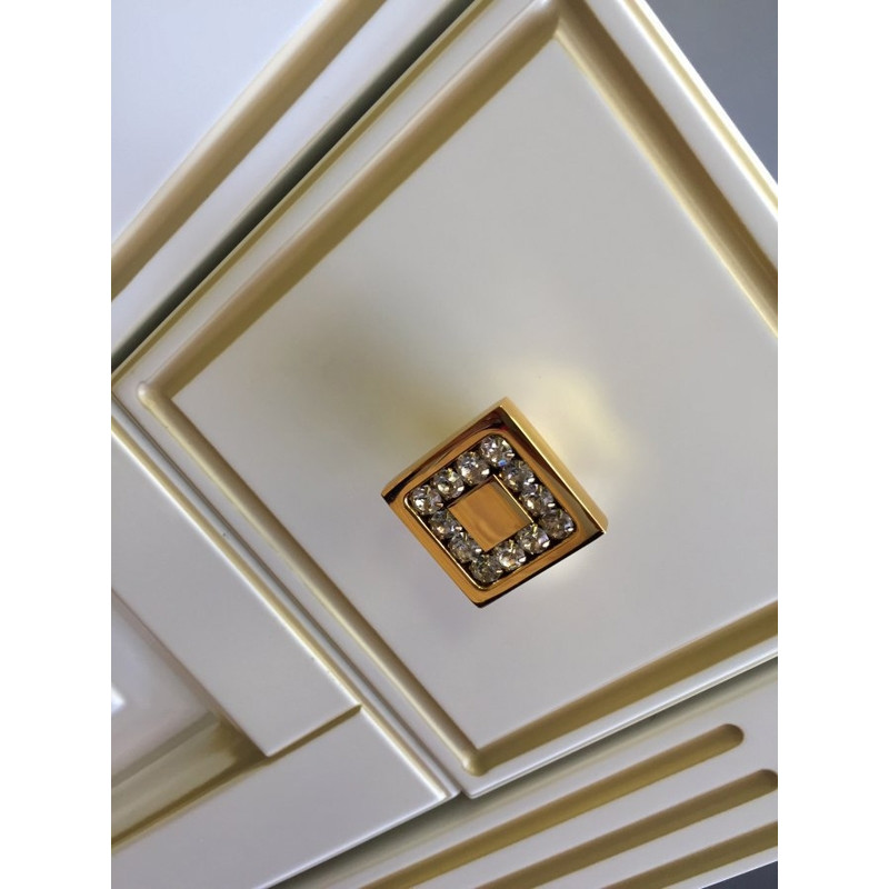 Тумба выполнена в классическом стиле с плавными изогнутыми формами и изящными гнутыми ножками. Фасадные элементы украшены резными узорами. Особую роскошь добавляют ручки инкрустированные кристаллами Swarovski.