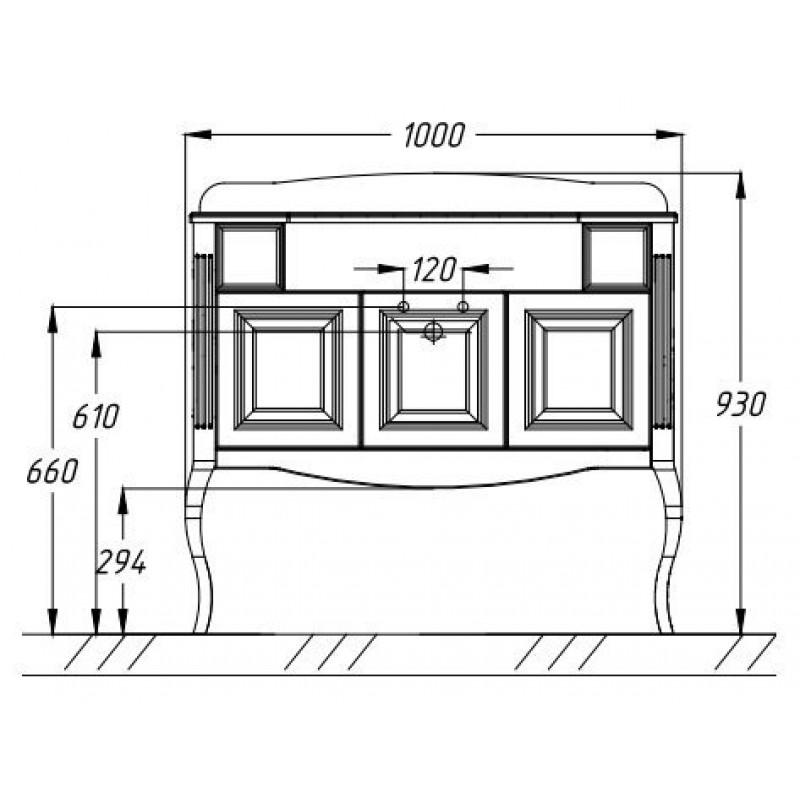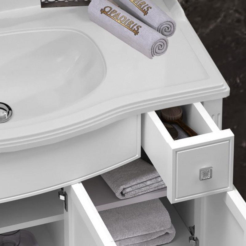 Тумба выполнена в классическом стиле с плавными изогнутыми формами и изящными гнутыми ножками. Фасадные элементы украшены резными узорами. Особую роскошь добавляют ручки инкрустированные кристаллами Swarovski.