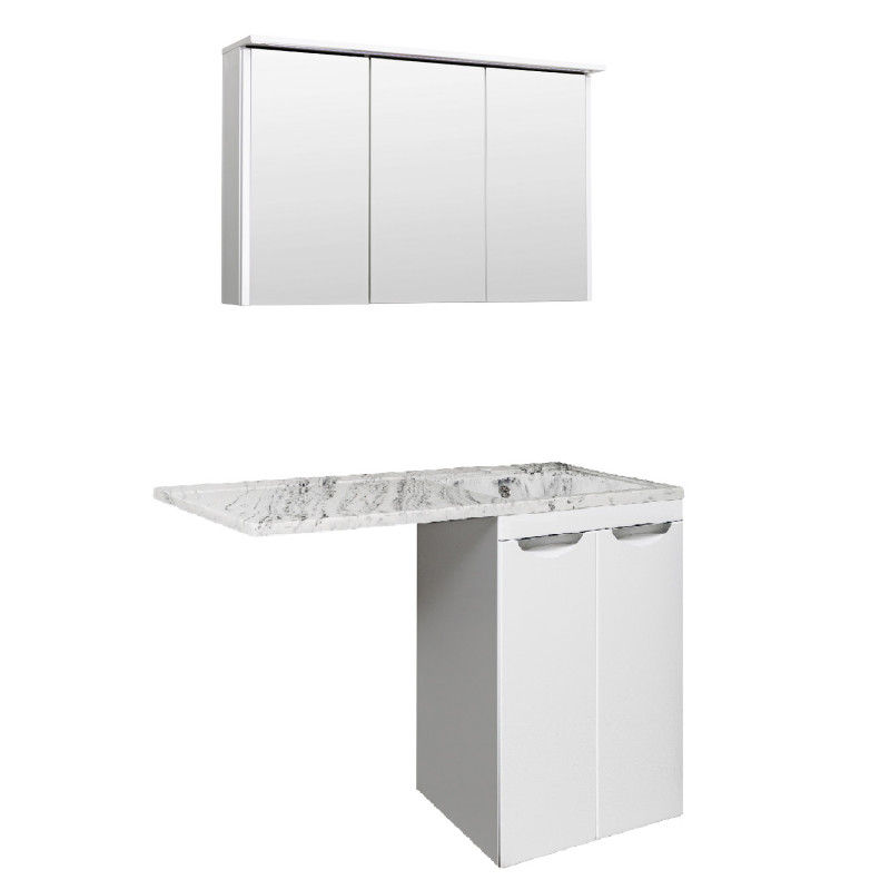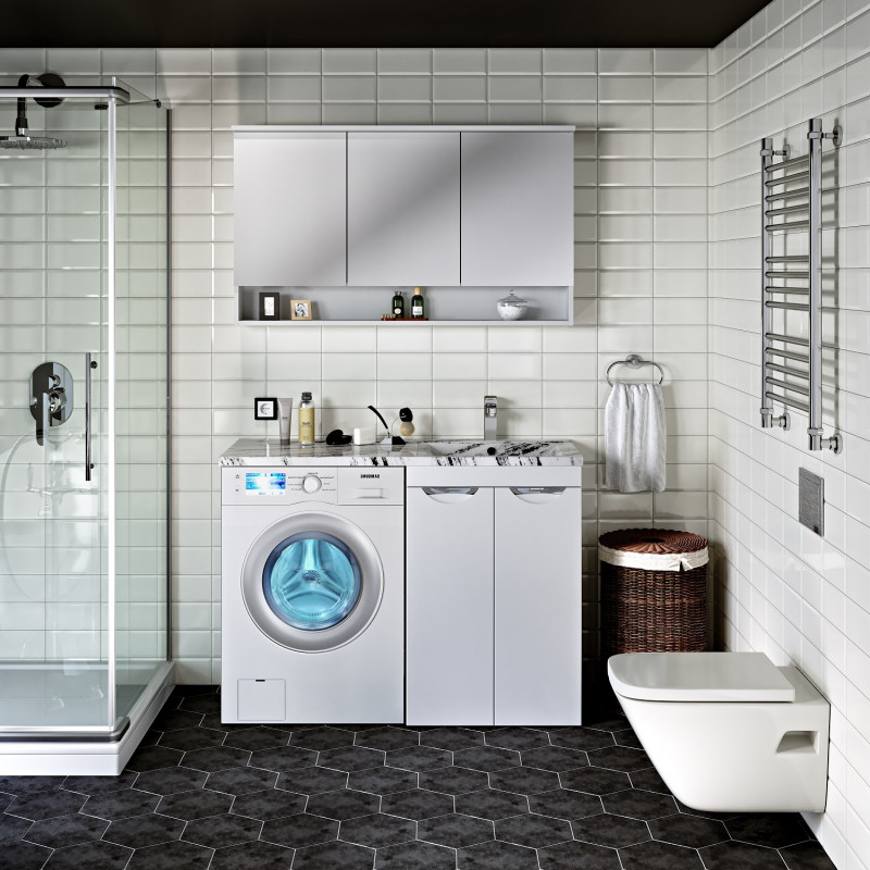 Тумба под умывальник напольная с двумя распашными фасадами и одной внутренней полкой. Петли со встроенным доводчиком, ручки врезные - 2шт. Устанавливается на 4-е пластиковые опоры, скрытые за нижней съемной фальшь-панелью. Комплект предусматривает установку стиральной машины размером 60х45х85см под крылом умывальника слева от тумбы.
