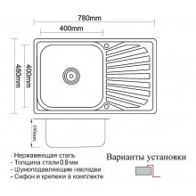 Мойка, сливная арматура с корзинчатым вентилем 3 1/2", сифон с отводом, комплект креплений, шаблон.