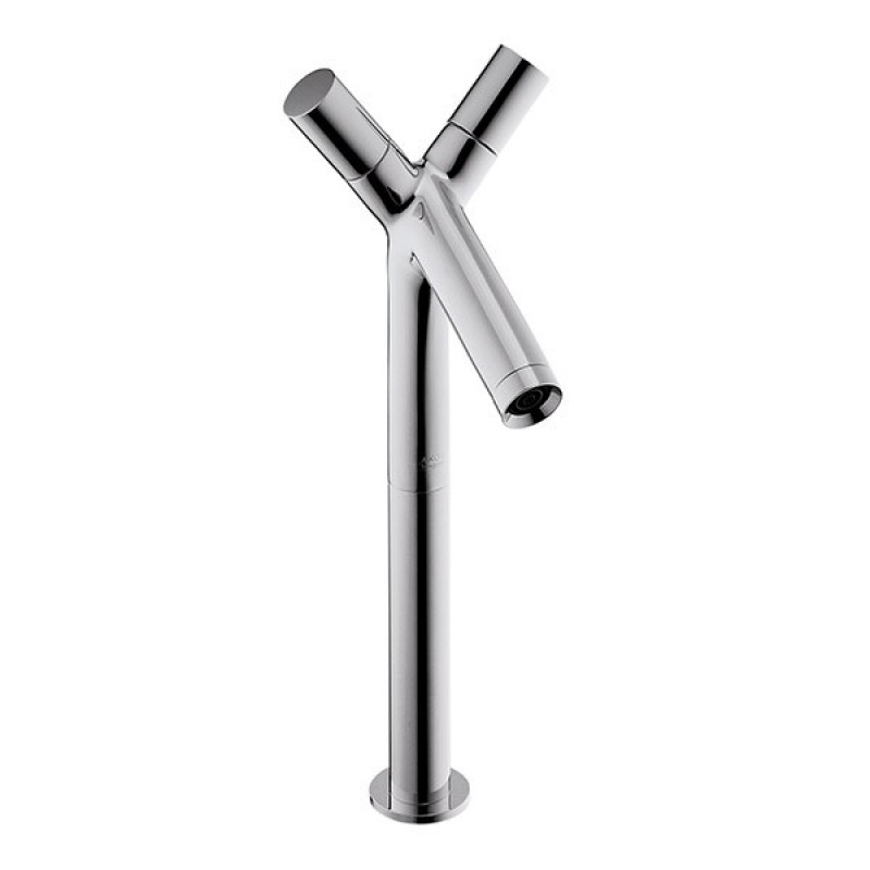 Смеситель Axor Starck ( Старк ) 10050 для раковины, высокая модель, двухвентильный. Донный клапан 1 1/4", высокий корпус, для раковины в форме таза, монтаж на 1 отверстие, система быстрого монтажа, рекомендуем подключать смеситель к водопроводной трубе холодной и горячей воды при помощи углового вентиля (13954), рекомендуем для открытых или стеклянных раковин устанавливать сифон (52100) или комплект (52120), гибкая подводка, система Elastop, ограничитель расхода воды до 7 л/мин, подходит для проточных водонагревателей.