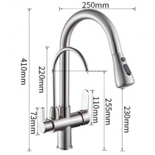 Главной особенностью кухонного смесителя этой модели выступает наличие дополнительного крана для подачи очищенной воды, оснащенного переключателем потока воды на 2 режима – струя и душ, что повышает функциональность прибора.