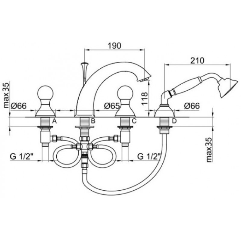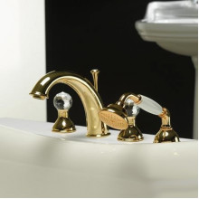 Смеситель на борт ванны Webert Karenina КА730101010 с душевым гарнитуром. Цвет: золото. Ручки: кристаллы Swarovski. Материал: латунь (содержание свинца: <0.2%). Излив 190 мм. Стандарт подключения: G1/2. ручной душ75 мм. Шланг 1500 мм.