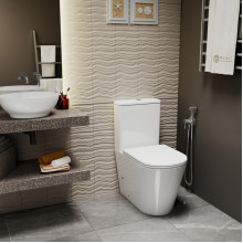 Безободковый, напольный унитаз-компакт с антибактериальным сиденьем с плавным закрыванием и легкосъемным механизмом. Двухуровневая арматура с механизмом смыва 3/5л