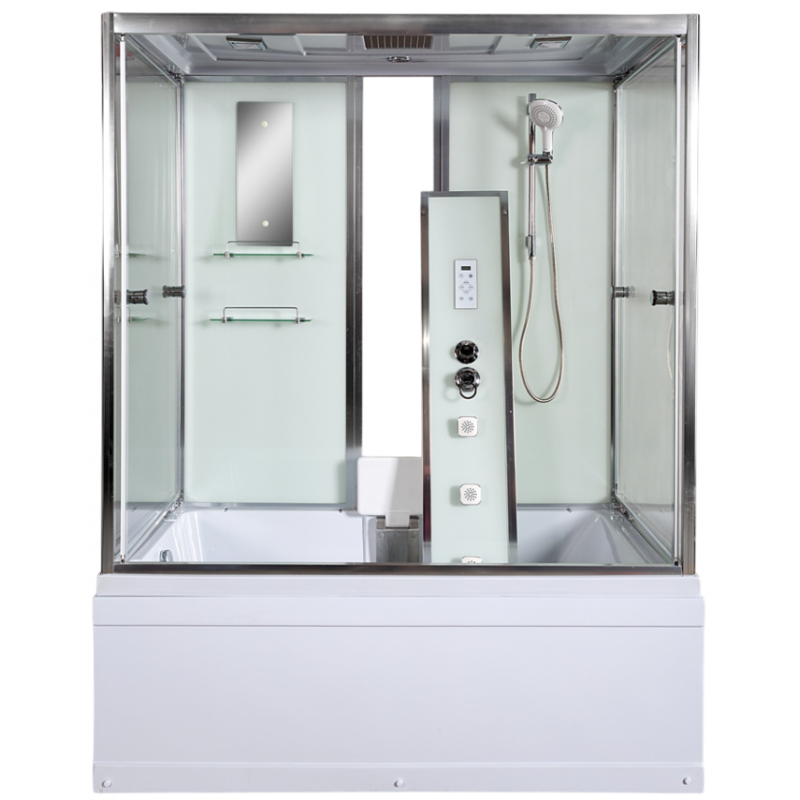 В комплекте зеркало, сенсорный пульт управления, передний съемный экран, донный клапан (клик-клак), душевой гарнитур, тропический (верхний) душ, откидное сиденье, гидромассажные форсунки, смеситель, переключатель режимов, вентиляция, радио.