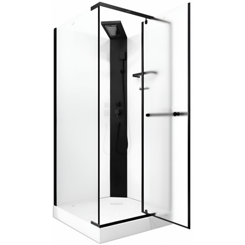 Кабина собрана из надёжных, долговечных материалов. Акриловый поддон (квадратная форма) придает эстетичность ванной комнате. Боковые профили из анодированного алюминия черного цвета, устойчивы к коррозии, а верхние/нижние профили из нержавеющей стали обеспечивают изделию прочность и долговечность. Переднее закалённое матовое стекло - 6 мм, а заднее закалённое стекло с белой окраской - 5 мм. Металлические петли способствуют плавному открыванию дверей и обеспечивают долгий срок службы.