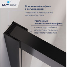 Душевой уголок с открытием двери вовнутрь RGW LE-45B из стекла в алюминиевом каркасе, с откатной дверью во внутреннее пространство душевого угла, которое при сборке образует закрытое, герметичное пространство душевой зоны в ванной комнате, то есть душевую кабину. Душевой угол устанавливается на душевой поддон, на подиум пола, выложенного керамической плиткой.