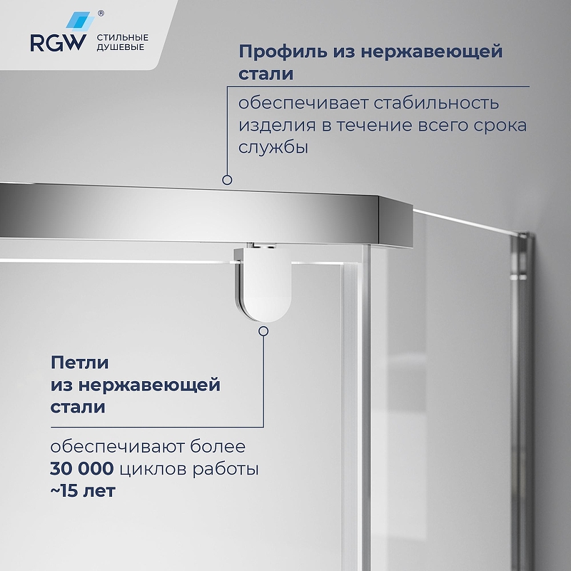 Водонепроницаемые стальные петли являются еще одним важным компонентом этого душевого уголка. Они гарантируют надежное крепление дверей и обеспечивают плавное и бесшумное их открывание и закрывание. Благодаря этому механизму конструкция дверей остается устойчивой и надежной даже при интенсивном использовании.
