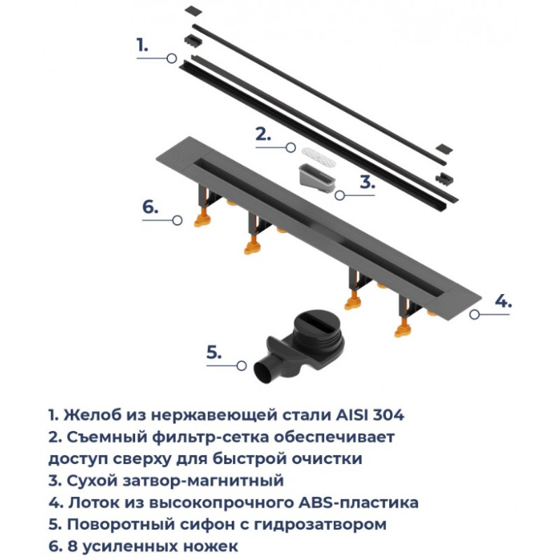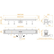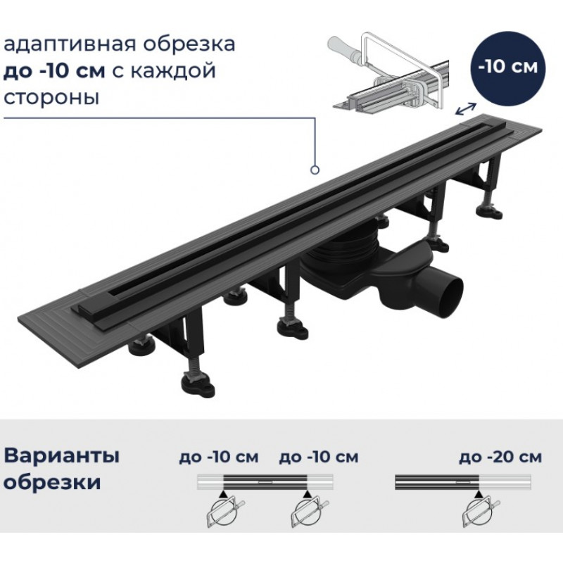 Отличительной особенностью душевого лотка RGW SDR – 55B является то, что на этапе монтажа общий размер лотка можно уменьшить на ~ 20 см. Конструкция модели на этапе монтажа позволяет обрезать лоток трапа и сливного желоба до 10 см с каждой стороны.