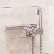 - Отдельно накладкой на смеситель в комплекте имеется полка и кронштейн, он же держатель туалетной бумаги или полотенца. Полочка и держатель выполнены из нержавеющей стали толщиной 3 мм. Дополнительно на полочке присутствует небольшой бортик, который предотвращает соскальзывание предметов и удерживает мелкие и небольшие предметы внутри полки, предотвращая их потерю. Во время и после использования душа не нужно идти за средствами гигиены и туалетной бумагой, благодаря смесителю с держателем и полочкой все необходимое находится под рукой. Такая конструкция экономит место, так как не нужно устанавливать отдельно держатель и полочку, занимая дополнительное место на стене. Гигиенический душ с держателем для туалетной бумаги и полочкой из нержавеющей стали повышает уровень комфорта.