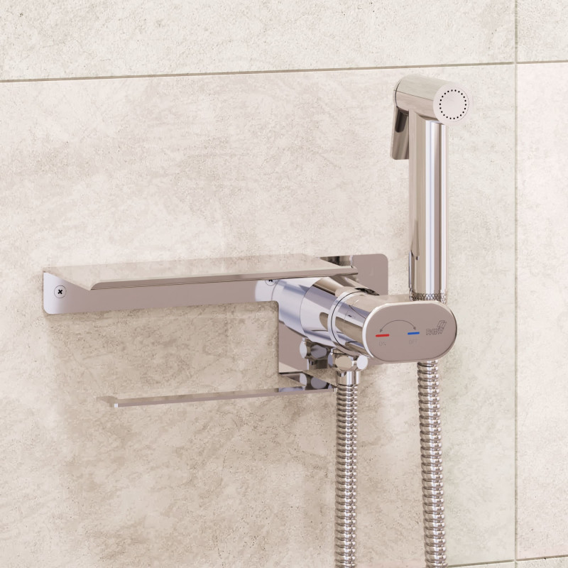 Гигиенический смеситель с прогрессивным картриджем, встраиваемый в стену, с накладной полкой и держателем туалетной бумаги или полотенца, гигиеническая лейка в комплекте - RGW SP-221, хром