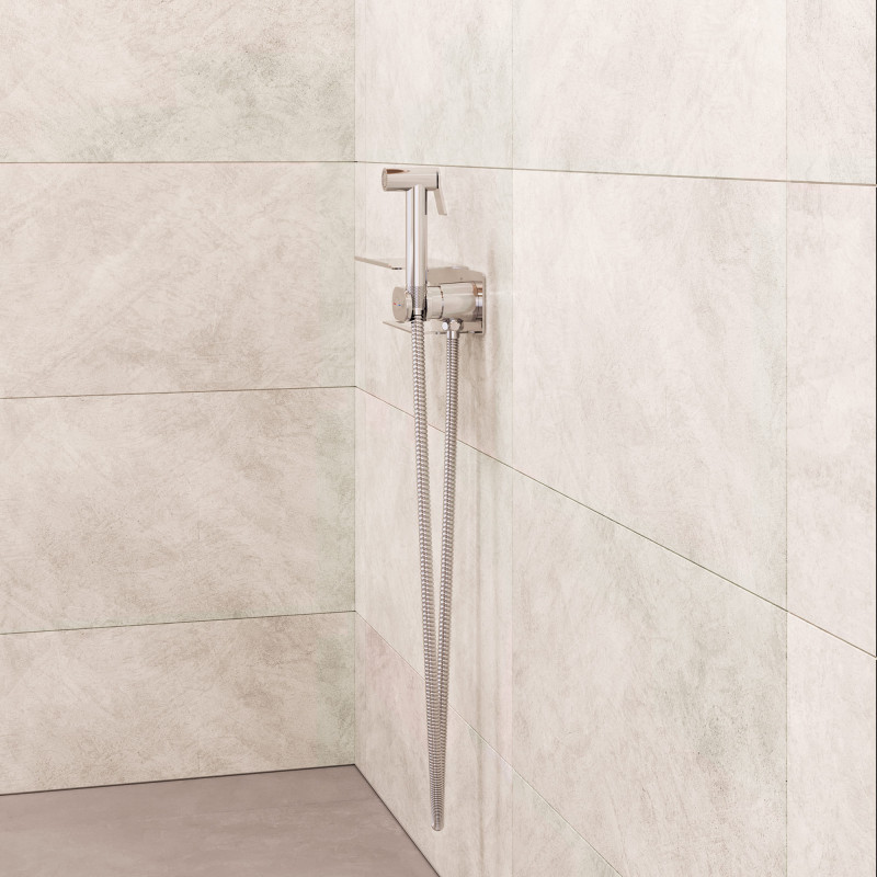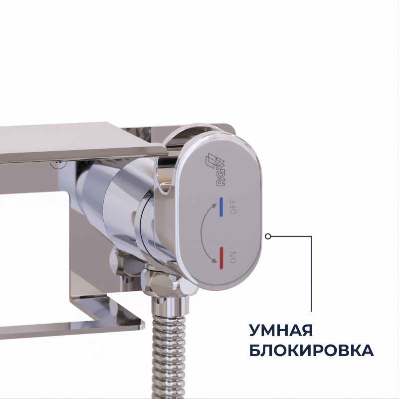 Комплект Гигиенического душа с прогрессивным картриджем, встроенный в стену, цвета хром RGW SP-221 с прогрессивным смесителем для плавного управления температурой (от холодной до горячей) и краном (затвором подачи воды) с держателем лейки --- система «Умная блокировка».