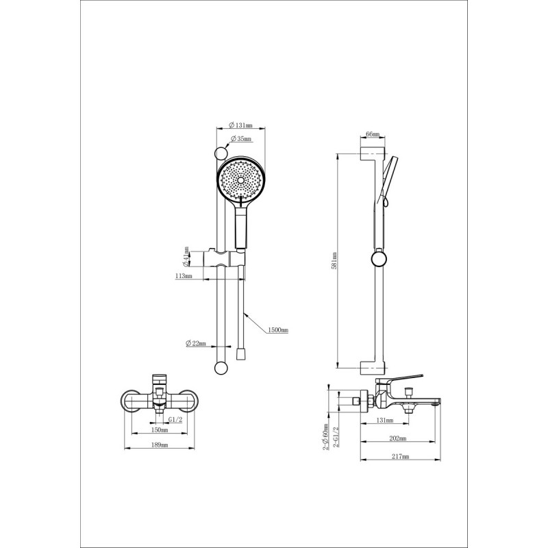 Комплектация: смеситель, душевой шланг, держатель для душа, душевая штанга, душевая лейка, эксцентрики, монтажный комплект