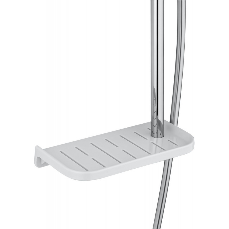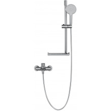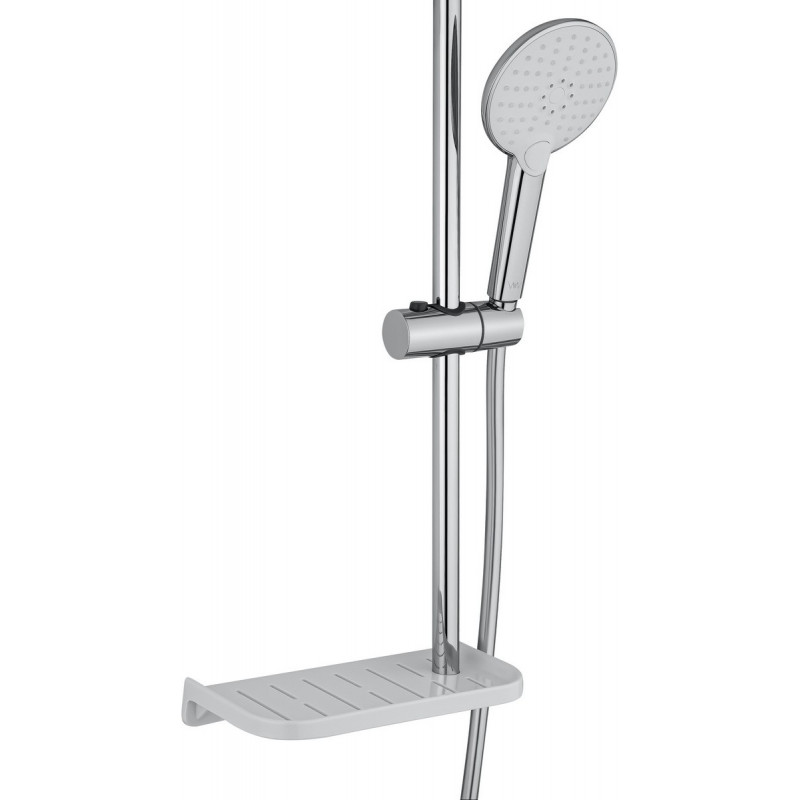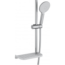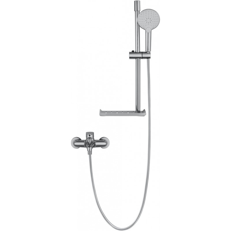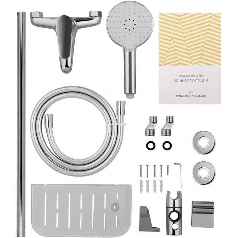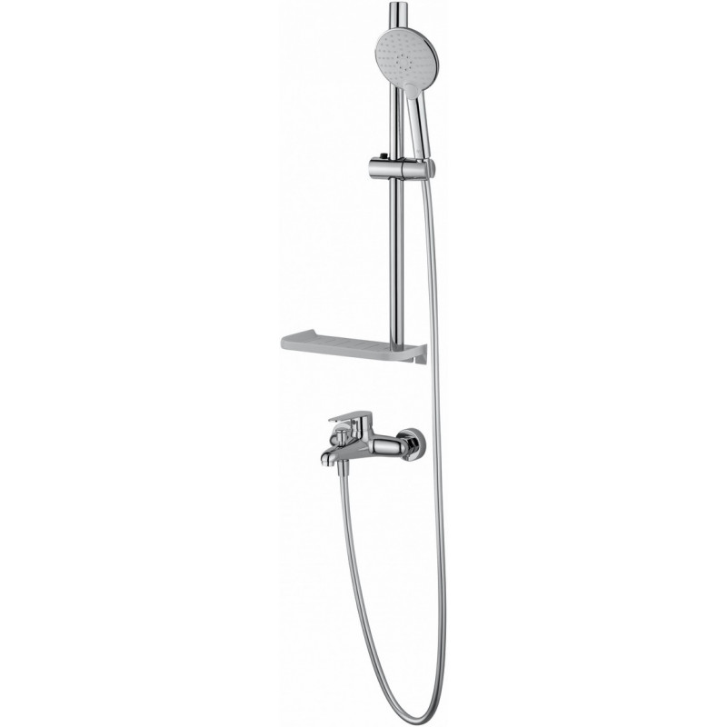 Комплектация: смеситель, душевой шланг, держатель для душа, полка, душевая штанга, душевая лейка, эксцентрики, монтажный комплект