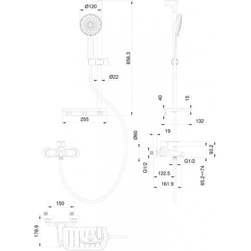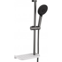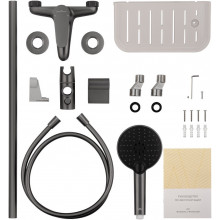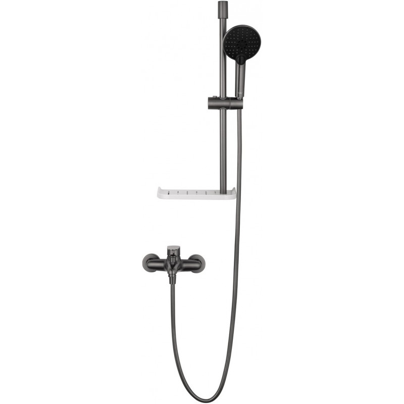 Комплектация: смеситель, душевой шланг, держатель для душа, полка, душевая штанга, душевая лейка, эксцентрики, монтажный комплект
