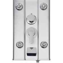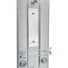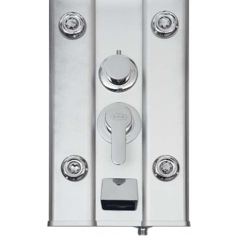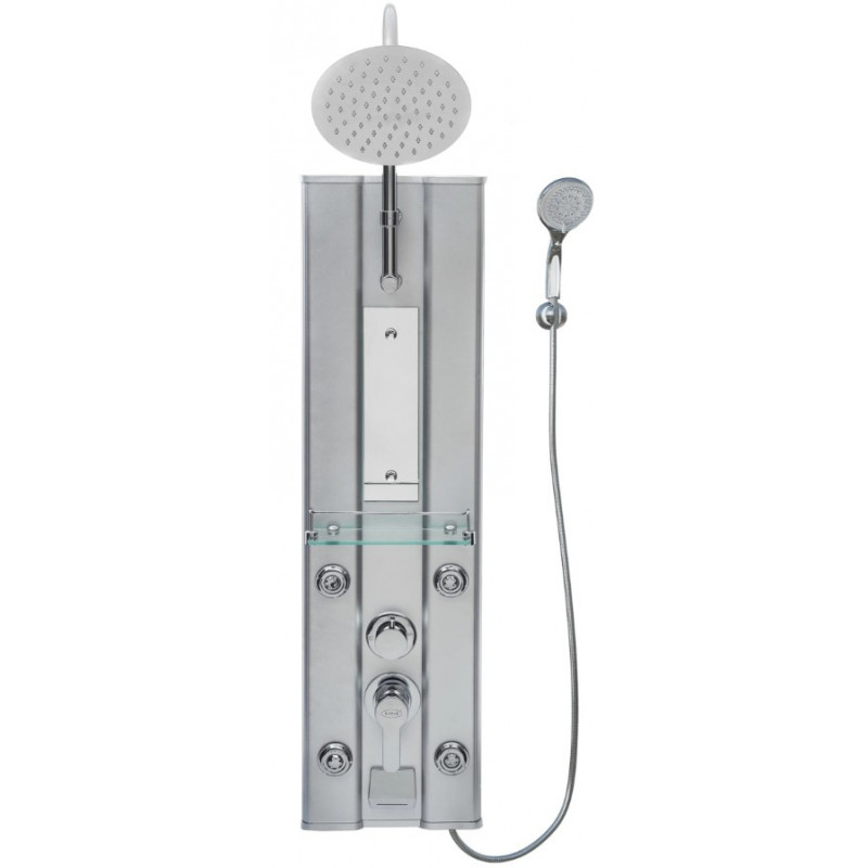 Душевая панель River Guron 01 10000001241 изготовлена из акрила и имеет полочку, верхний душ, зеркало, смеситель, трехпозиционный ручной душ, шесть гидромасссажных форсунок, каскадный излив.