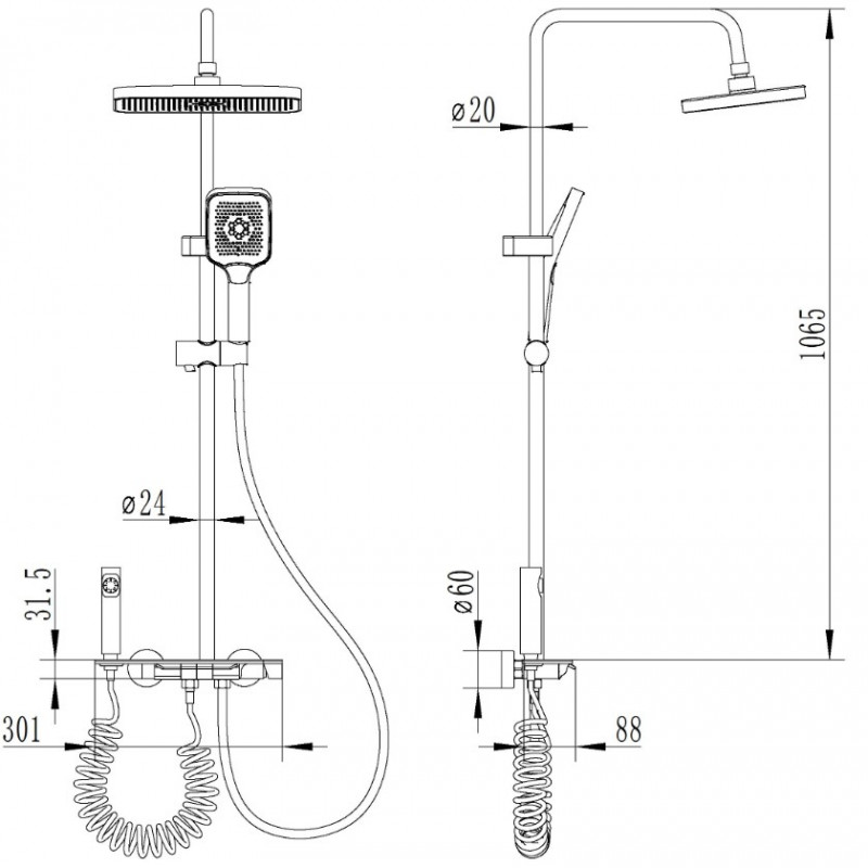 Комплектация: верхний душ, ручной душ, душевой шланг с защитой от перегибов и перекручивания, излив.