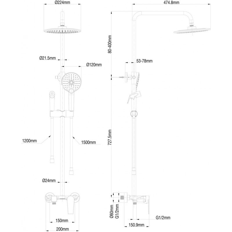 Комплектация: смеситель, душевой шланг 150 см, душевой шланг 120 см, держатель для душа, душевая штанга, верхний душ, душевая лейка, лейка гигиенического душа, полка, эксцентрики, монтажный комплект.