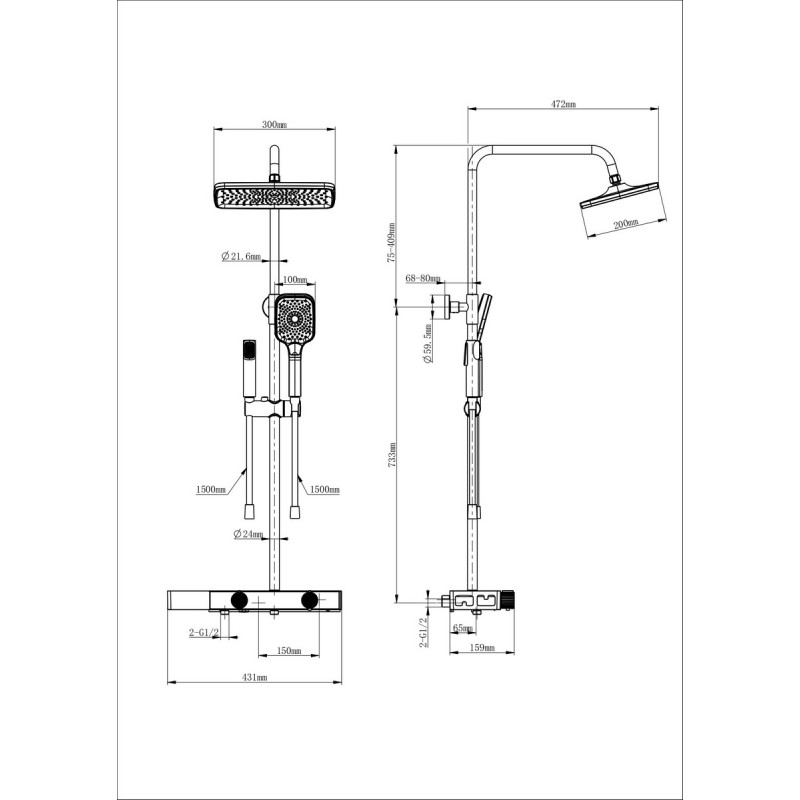 Комплектация: смеситель, душевой шланг 150 см, душевой шланг 120 см, держатель для душа, душевая штанга, верхний душ, душевая лейка, лейка гигиенического душа, полка, эксцентрики, монтажный комплект.
