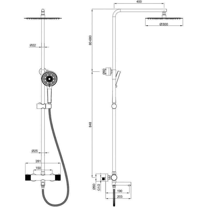 Комплектация: смеситель, душевой шланг, держатель для душа, душевая штанга, верхний душ, душевая лейка, эксцентрики, монтажный комплект.