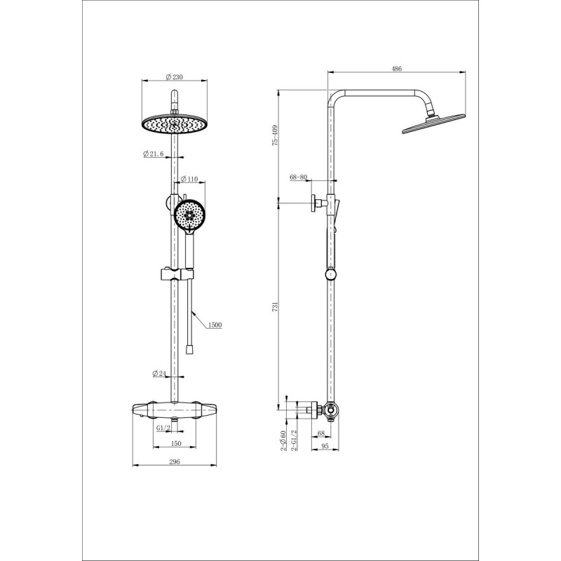 Комплектация: смеситель, душевой шланг, держатель для душа, душевая штанга, верхний душ, душевая лейка, эксцентрики, монтажный комплект.