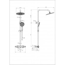 Комплектация: смеситель, душевой шланг, держатель для душа, душевая штанга, верхний душ, душевая лейка, эксцентрики, монтажный комплект.