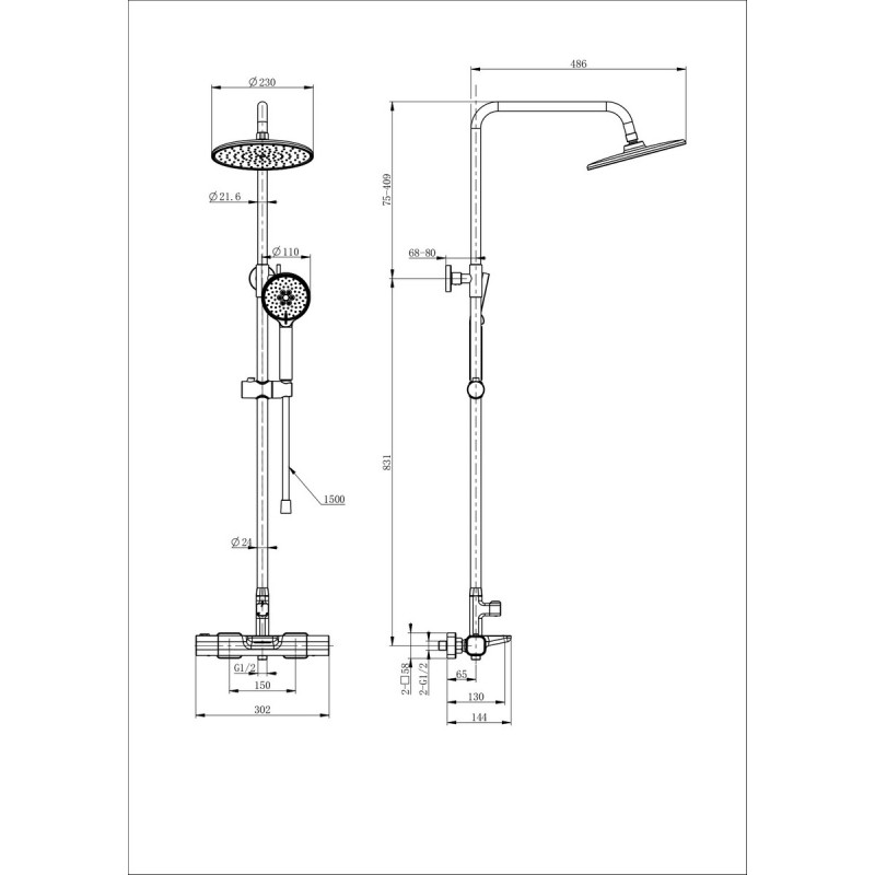 Комплектация: смеситель, душевой шланг, держатель для душа, душевая штанга, верхний душ, душевая лейка, эксцентрики, монтажный комплект.