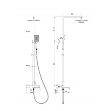 Комплектация: смеситель, душевой шланг, держатель для душа, душевая штанга, верхний душ, душевая лейка, эксцентрики, монтажный комплект