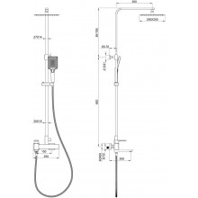 Комплектация: смеситель, душевой шланг, держатель для душа, душевая штанга, верхний душ, душевая лейка, эксцентрики, монтажный комплект