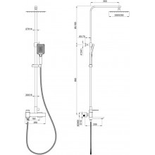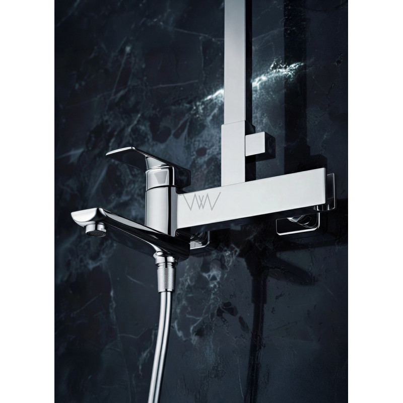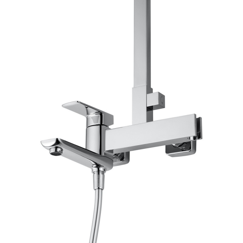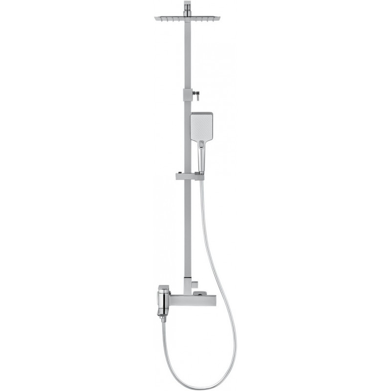 Комплектация: смеситель, душевой шланг, держатель для душа, душевая штанга, верхний душ, душевая лейка, эксцентрики, монтажный комплект