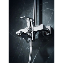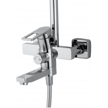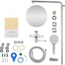 Комплектация: смеситель, душевой шланг, держатель для душа, душевая штанга, верхний душ, душевая лейка, эксцентрики, монтажный комплект
