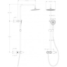 Комплектация: смеситель, душевой шланг, держатель для душа, душевая штанга, верхний душ, душевая лейка, эксцентрики, монтажный комплект