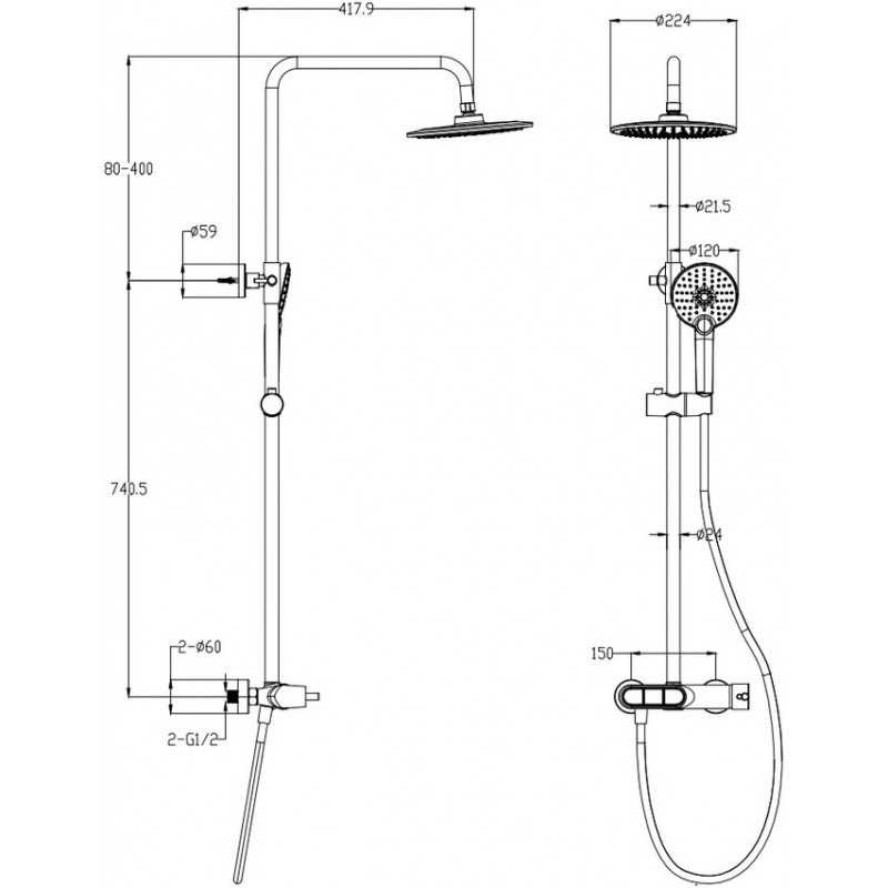 Комплектация: смеситель, душевой шланг, держатель для душа, душевая штанга, верхний душ, душевая лейка, эксцентрики, монтажный комплект