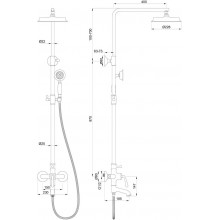 Комплектация: смеситель, душевой шланг, держатель для душа, душевая штанга, верхний душ, душевая лейка, эксцентрики, монтажный комплект