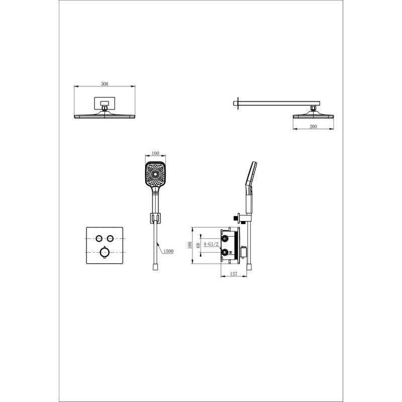 Комплектация: смеситель, душевой шланг, держатель для душа, душевая штанга, верхний душ, душевая лейка, эксцентрики, монтажный комплект.