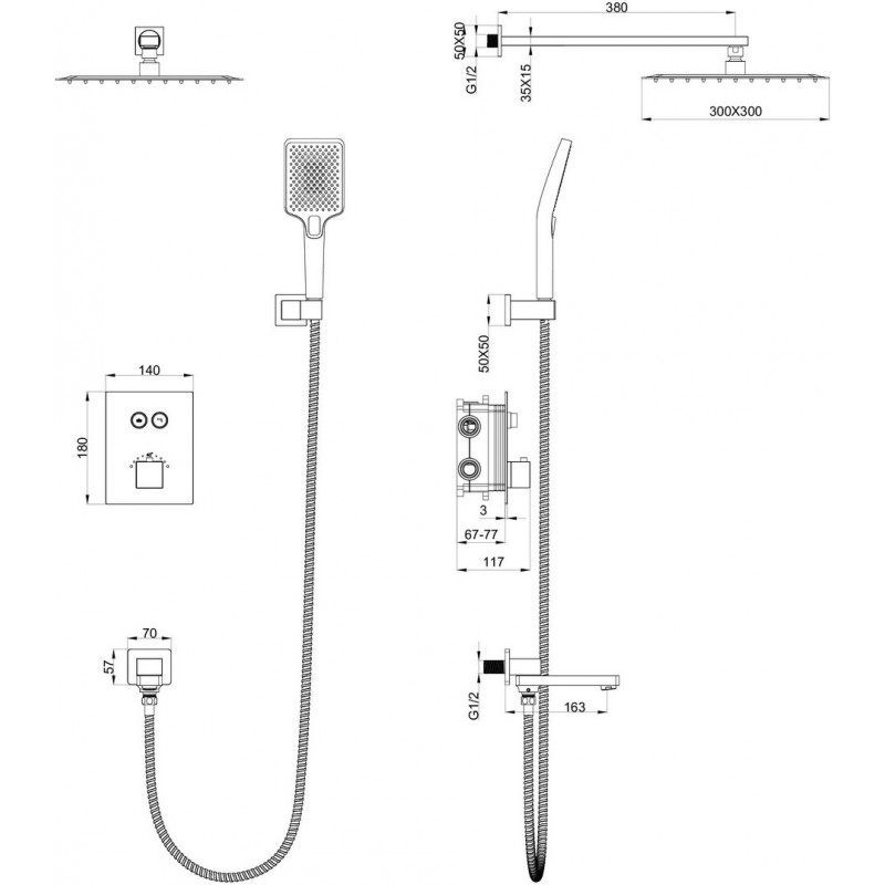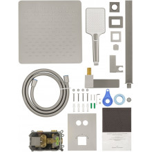 Комплектация: смеситель, душевой шланг, держатель для душа, верхний душ, душевая лейка, эксцентрики, монтажный комплект.