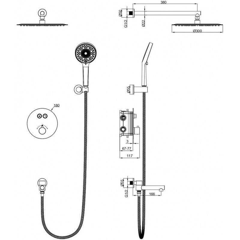 Комплектация: смеситель, душевой шланг, держатель для душа, душевая штанга, верхний душ, душевая лейка, эксцентрики, монтажный комплект.