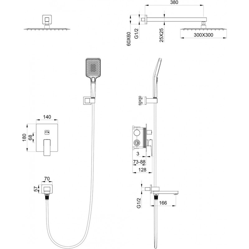 Комплектация: смеситель, душевой шланг, держатель для душа, верхний душ, душевая лейка, монтажный комплект.